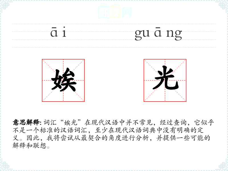词汇“娭光”在现代汉语中并不常见,经过查询,它似乎不是一个标准的汉语词汇,至少在现代汉语词典中没有明确的定义。因此,我将尝试从最契合的角度进行分析,并提供一些可能的解释和联想。