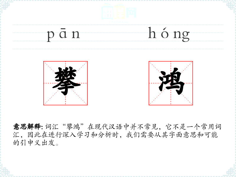词汇“攀鸿”在现代汉语中并不常见,它不是一个常用词汇,因此在进行深入学*和分析时,我们需要从其字面意思和可能的引申义出发。