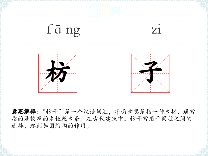 “枋子”是一个汉语词汇,字面意思是指一种木材,通常指的是较窄的木板或木条。在古代建筑中,枋子常用于梁柱之间的连接,起到加固结构的作用。
