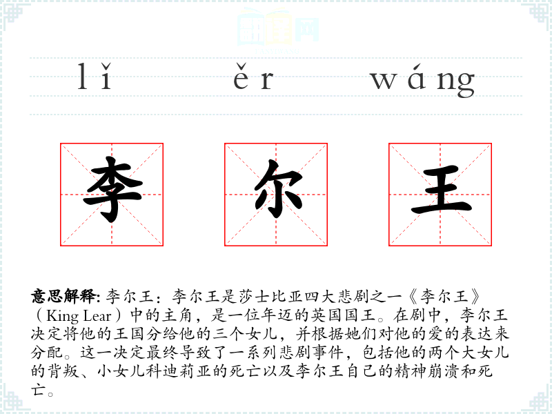 “李尔王”一词源自莎士比亚的戏剧作品,其名字Lear在古英语中可能与“灰色”或“老”有关,暗示了角色的年龄和状态。随着时间的推移,这个词汇在英语文学和文化中获得了特定的象征意义。