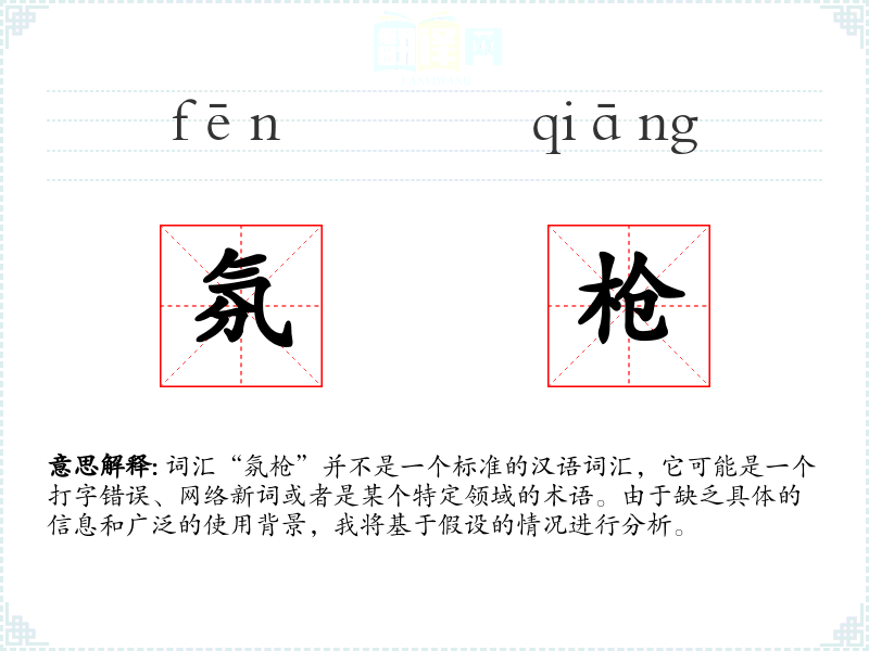 词汇“氛枪”并不是一个标准的汉语词汇,它可能是一个打字错误、网络新词或者是某个特定领域的术语。由于缺乏具体的信息和广泛的使用背景,我将基于假设的情况进行分析。