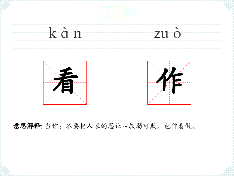 当作:不要把人家的忍让~软弱可欺。也作看做。