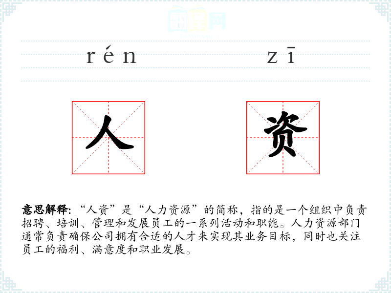 “人资”是“人力资源”的简称,指的是一个组织中负责招聘、培训、管理和发展员工的一系列活动和职能。人力资源部门通常负责确保公司拥有合适的人才来实现其业务目标,同时也关注员工的福利、满意度和职业发展。