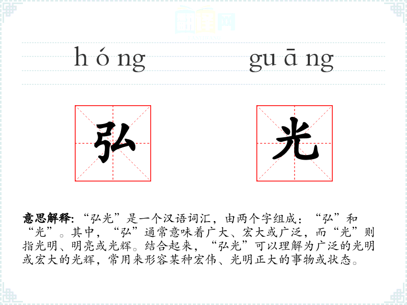 “弘光”是一个汉语词汇,由两个字组成:“弘”和“光”。其中,“弘”通常意味着广大、宏大或广泛,而“光”则指光明、明亮或光辉。结合起来,“弘光”可以理解为广泛的光明或宏大的光辉,常用来形容某种宏伟、光明正大的事物或状态。