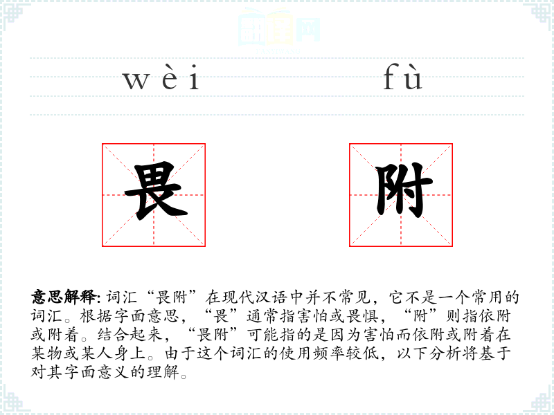 “畏附”的字面意思是因为害怕而依附或附着。这个词汇可能用于描述一种心理状态或行为,即个体因为恐惧而不得不依赖或附着于某个对象。