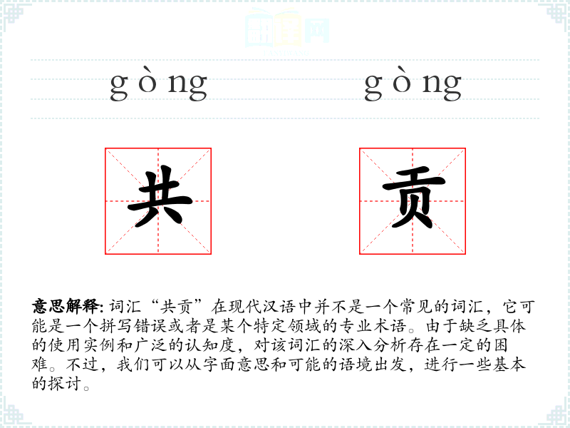 词汇“共贡”在现代汉语中并不是一个常见的词汇,它可能是一个拼写错误或者是某个特定领域的专业术语。由于缺乏具体的使用实例和广泛的认知度,对该词汇的深入分析存在一定的困难。不过,我们可以从字面意思和可能的语境出发,进行一些基本的探讨。