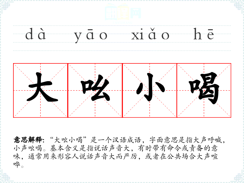 “大吆小喝”是一个汉语成语,字面意思是指大声呼喊,小声吆喝。基本含义是指说话声音大,有时带有命令或责备的意味,通常用来形容人说话声音大而严厉,或者在公共场合大声喧哗。