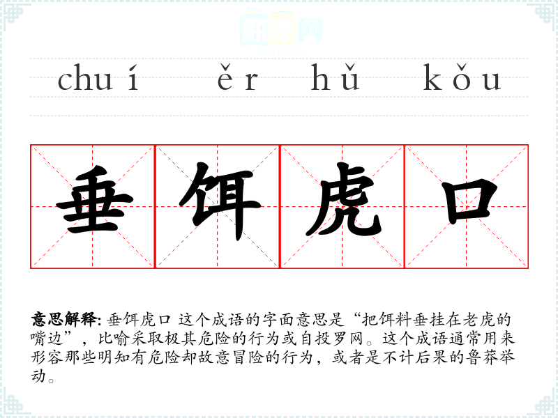 垂饵虎口 这个成语的字面意思是“把饵料垂挂在**的嘴边”,比喻采取极其危险的行为或自投罗网。这个成语通常用来形容那些明知有危险却故意冒险的行为,或者是不计后果的鲁莽举动。