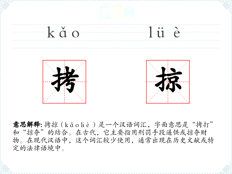 拷掠(kǎo liè)是一个汉语词汇,字面意思是“拷打”和“掠夺”的结合。在古代,它主要指用刑罚手段逼供或掠夺财物。在现代汉语中,这个词汇较少使用,通常出现在历史文献或特定的法律语境中。