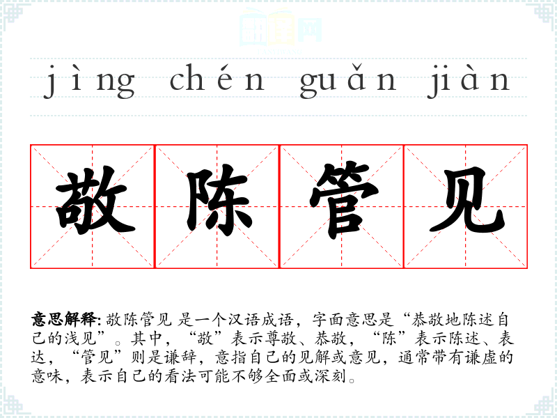 敬陈管见 是一个汉语成语,字面意思是“恭敬地陈述自己的浅见”。其中,“敬”表示尊敬、恭敬,“陈”表示陈述、表达,“管见”则是谦辞,意指自己的见解或意见,通常带有谦虚的意味,表示自己的看法可能不够全面或深刻。