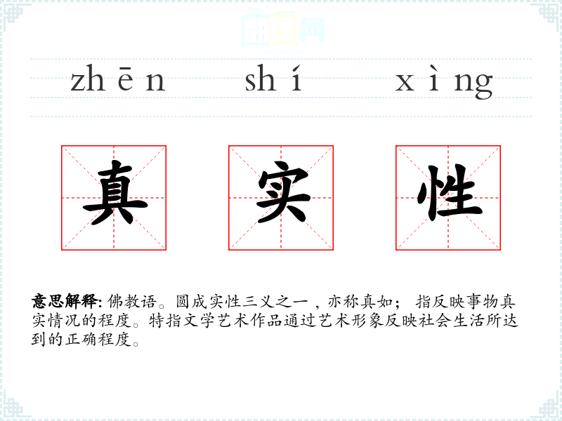 佛教语。圆成实性三义之一﹐亦称真如; 指反映事物真实情况的程度。特指文学艺术作品通过艺术形象反映社会生活所达到的正确程度。