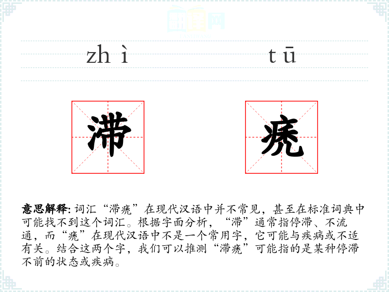 词汇“滞痜”在现代汉语中并不常见,甚至在标准词典中可能找不到这个词汇。根据字面分析,“滞”通常指停滞、不流通,而“痜”在现代汉语中不是一个常用字,它可能与疾病或不适有关。结合这两个字,我们可以推测“滞痜”可能指的是某种停滞不前的状态或疾病。