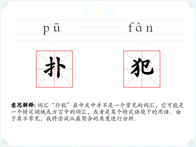 词汇“扑犯”在中文中并不是一个常见的词汇,它可能是一个特定领域或方言中的词汇,或者是某个特定语境下的用语。由于其不常见,我将尝试从最契合的角度进行分析。