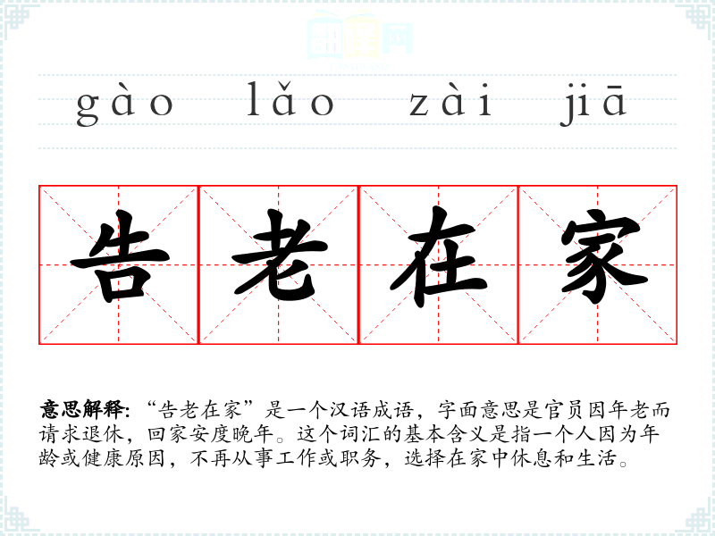 “告老在家”是一个汉语成语,字面意思是官员因年老而请求退休,回家安度晚年。这个词汇的基本含义是指一个人因为年龄或健康原因,不再从事工作或职务,选择在家中休息和生活。