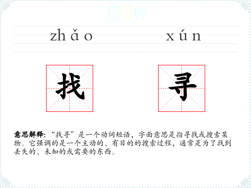 “找寻”由“找”和“寻”两个字组成,这两个字在古代汉语中都有寻找的意思。随着语言的发展,这两个字结合在一起,强调了寻找的持续性和主动性。