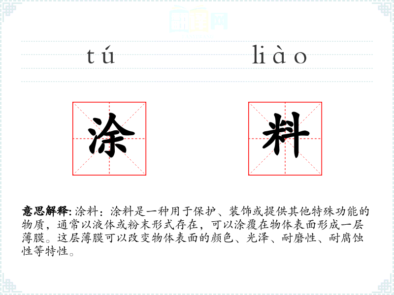 - 反义词:剥落、褪色(涂料的反义词更多是指其效果的反面,而非直接的反义词)