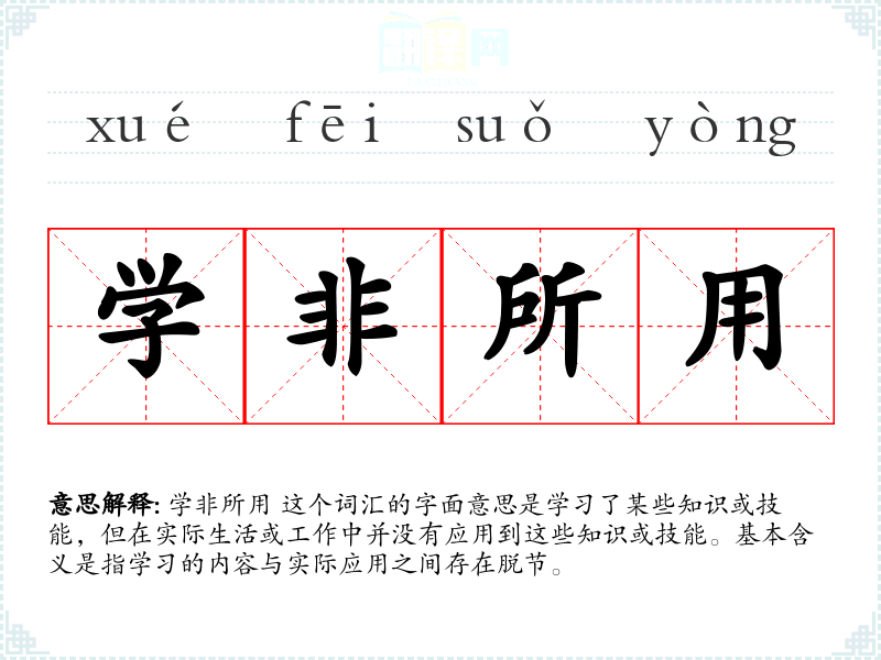 学非所用 这个词汇的字面意思是学了某些知识或技能,但在实际生活或工作中并没有应用到这些知识或技能。基本含义是指学的内容与实际应用之间存在脱节。