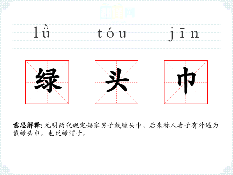 元明两代规定娼家男子戴绿头巾。后来称人妻子有外遇为戴绿头巾。也说绿帽子。