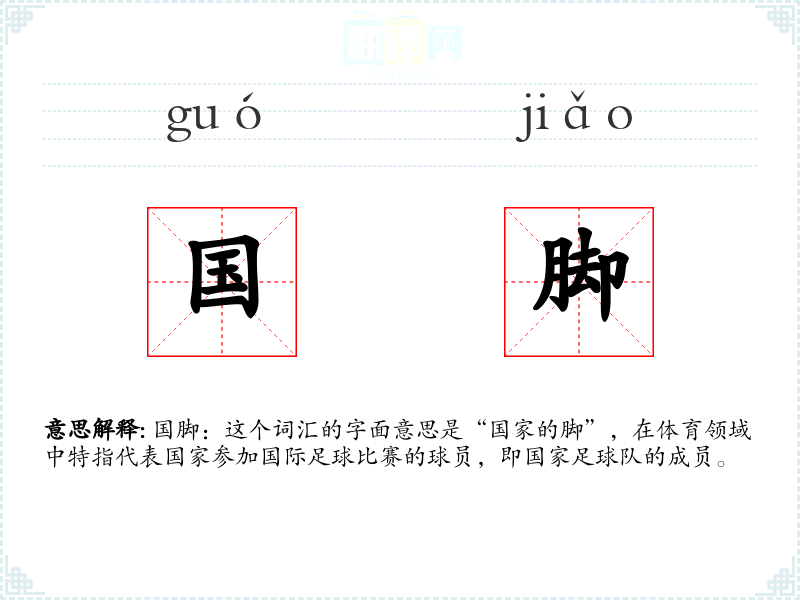 国脚:这个词汇的字面意思是“国家的脚”,在体育领域中特指代表国家参加国际足球比赛的球员,即国家足球队的成员。