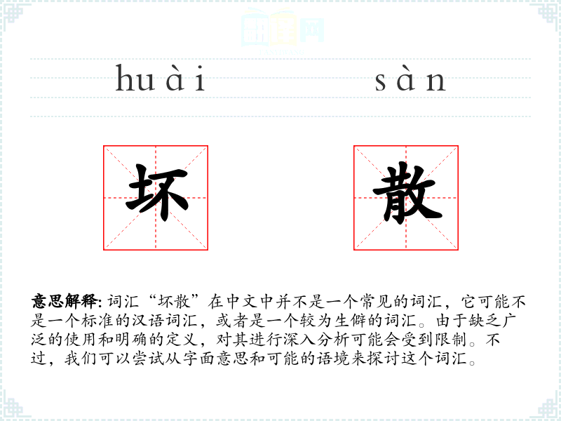 在特定的文化或社会背景中,“坏散”可能被用来形容某种社会结构或组织的崩溃,或者某种传统习俗的消失。