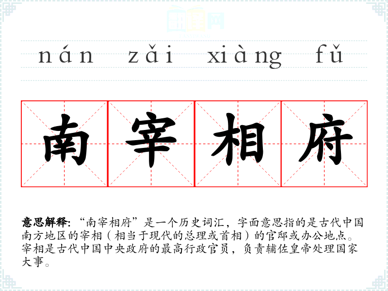 “南宰相府”是一个历史词汇,字面意思指的是古代南方地区的宰相(相当于现代的总理或首相)的官邸或办公地点。宰相是古代中央政府的最高行政官员,负责辅佐**处理国家大事。