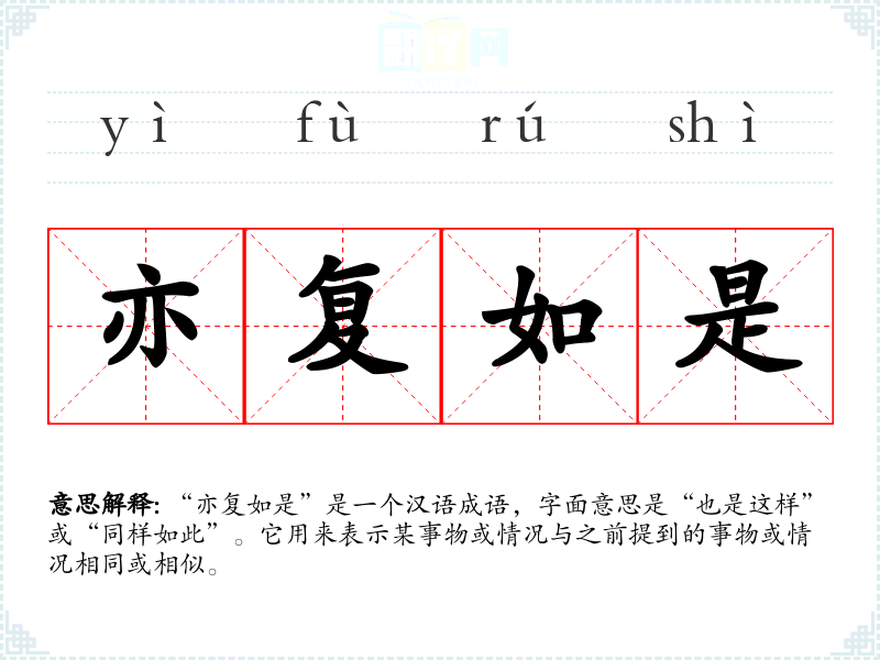 “亦复如是”是一个汉语成语,字面意思是“也是这样”或“同样如此”。它用来表示某事物或情况与之前提到的事物或情况相同或相似。