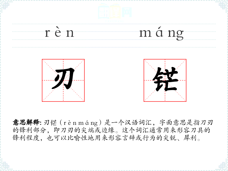 刃铓(rèn máng)是一个汉语词汇,字面意思是指刀刃的锋利部分,即刀刃的尖端或边缘。这个词汇通常用来形容刀具的锋利程度,也可以比喻性地用来形容言辞或行为的尖锐、犀利。