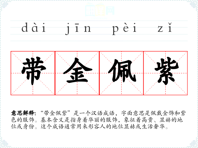 “带金佩紫”是一个汉语成语,字面意思是佩戴金饰和紫色的服饰。基本含义是指身着华丽的服饰,象征着高贵、显赫的地位或身份。这个成语通常用来形容人的地位显赫或生活奢华。