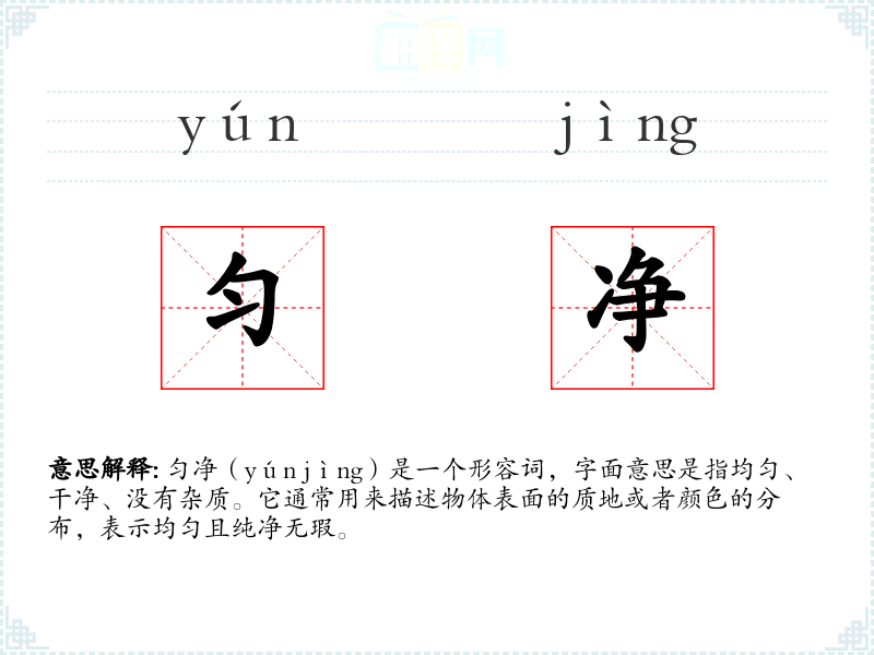 匀净(yún jìng)是一个形容词,字面意思是指均匀、干净、没有杂质。它通常用来描述物体表面的质地或者颜色的分布,表示均匀且纯净无瑕。