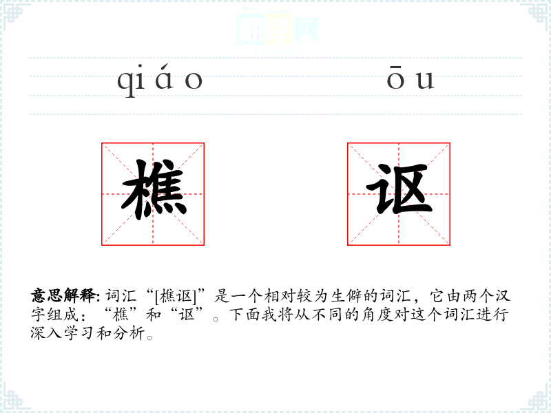- 词源:“樵”字最早见于《说文解字》,“讴”字则更早,见于《诗经》。