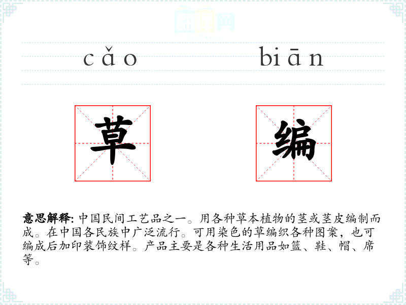 中国民间工艺品之一。用各种草本植物的茎或茎皮编制而成。在中国各民族中广泛流行。可用染色的草编织各种图案,也可编成后加印装饰纹样。产品主要是各种生活用品如篮、鞋、帽、席等。