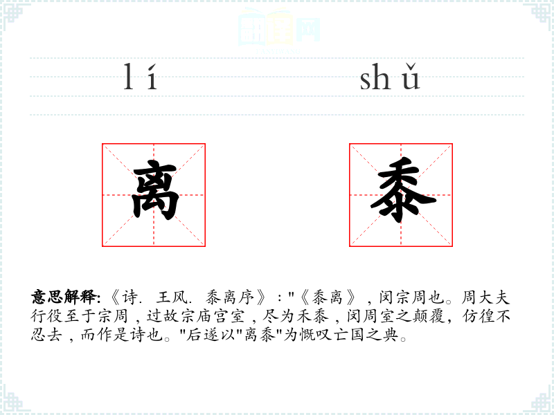 《诗.王风.黍离序》﹕"《黍离》﹐闵宗周也。周大夫行役至于宗周﹐过故宗庙宫室﹐尽为禾黍﹐闵周室之颠覆,仿徨不忍去﹐而作是诗也。"后遂以"离黍"为慨叹亡国之典。