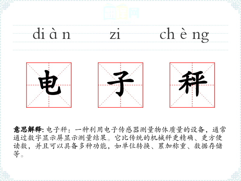 "电子秤"的意思解释、电子秤是什么意思由翻译网汉语词典查词提供。