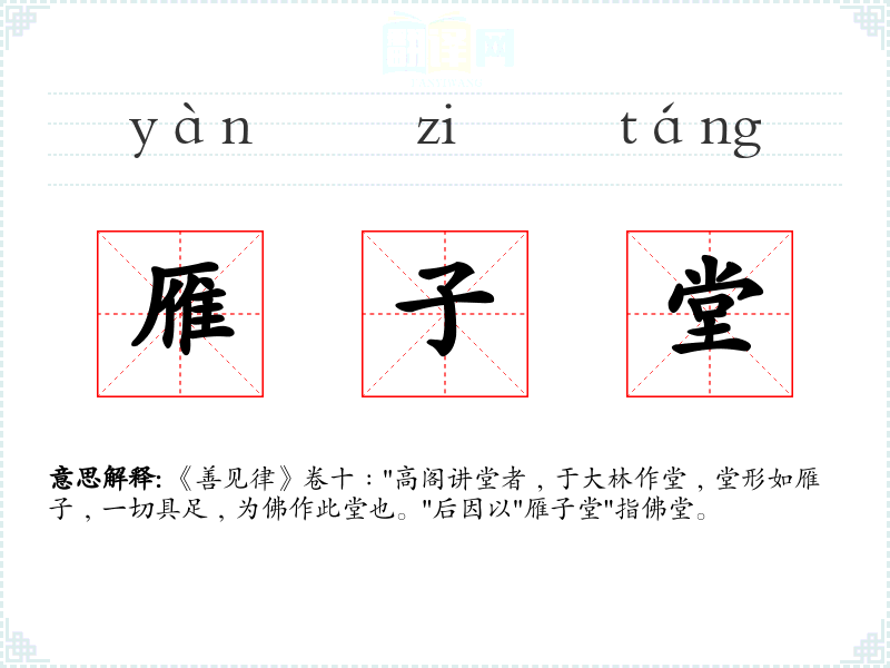 《善见律》卷十﹕"高阁讲堂者﹐于大林作堂﹐堂形如雁子﹐一切具足﹐为佛作此堂也。"后因以"雁子堂"指佛堂。