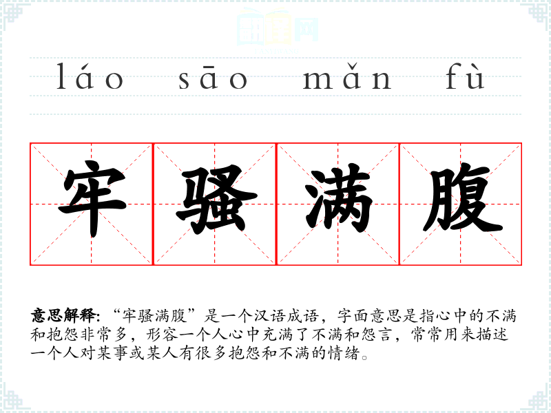 “牢骚满腹”是一个汉语成语,字面意思是指心中的不满和抱怨非常多,形容一个人心中充满了不满和怨言,常常用来描述一个人对某事或某人有很多抱怨和不满的情绪。