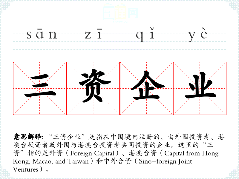“三资企业”是指在**境内注册的,由外国投资者、港澳台投资者或外国与港澳台投资者共同投资的企业。这里的“三资”指的是外资(Foreign Capital)、港澳台资(Capital from Hong Kong, Macao, and Taiwan)和中外合资(Sino-foreign Joint Ventures)。