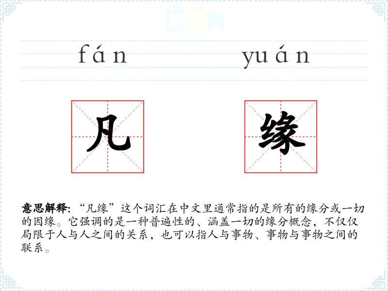 “凡缘”这个词汇在中文里通常指的是所有的缘分或一切的因缘。它强调的是一种普遍性的、涵盖一切的缘分概念,不仅仅局限于人与人之间的关系,也可以指人与事物、事物与事物之间的联系。
