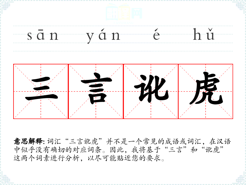 词汇“三言讹虎”并不是一个常见的成语或词汇,在汉语中似乎没有确切的对应词条。因此,我将基于“三言”和“讹虎”这两个词素进行分析,以尽可能贴近您的要求。
