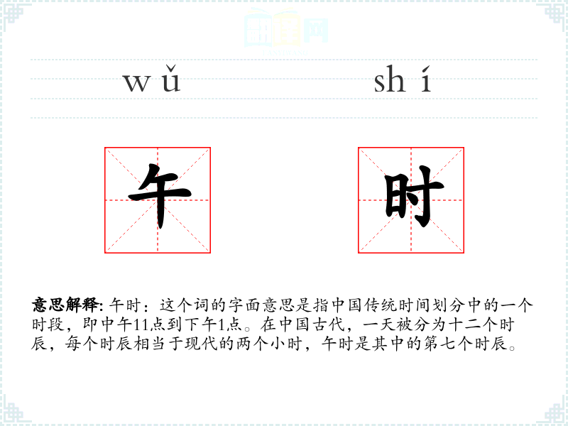 午时:这个词的字面意思是指传统时间划分中的一个时段,即中午11点到下午1点。在古代,一天被分为十二个时辰,每个时辰相当于现代的两个小时,午时是其中的第七个时辰。