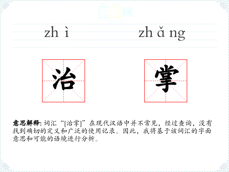 词汇“[治掌]”在现代汉语中并不常见,经过查询,没有找到确切的定义和广泛的使用记录。因此,我将基于该词汇的字面意思和可能的语境进行分析。