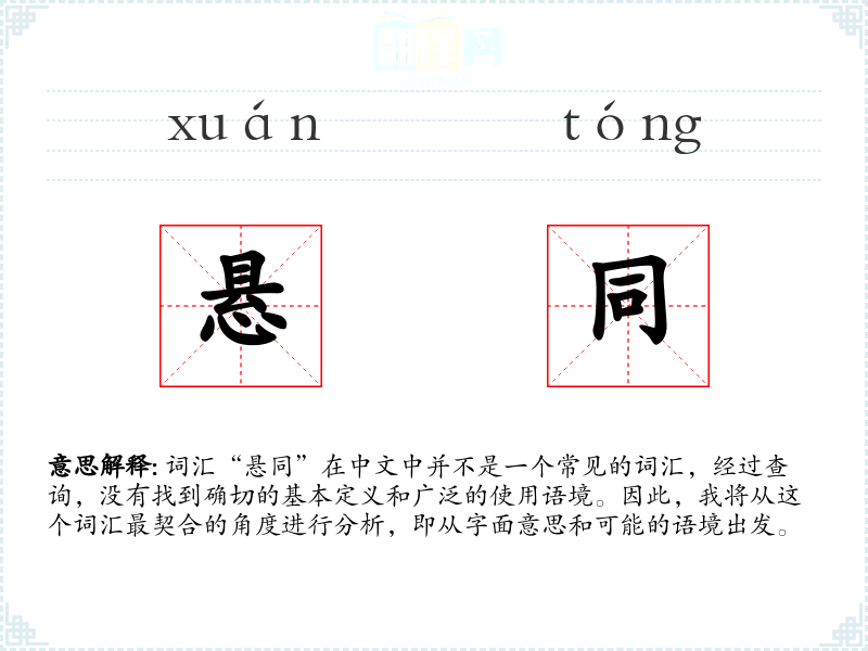 词汇“悬同”在中文中并不是一个常见的词汇,经过查询,没有找到确切的基本定义和广泛的使用语境。因此,我将从这个词汇最契合的角度进行分析,即从字面意思和可能的语境出发。