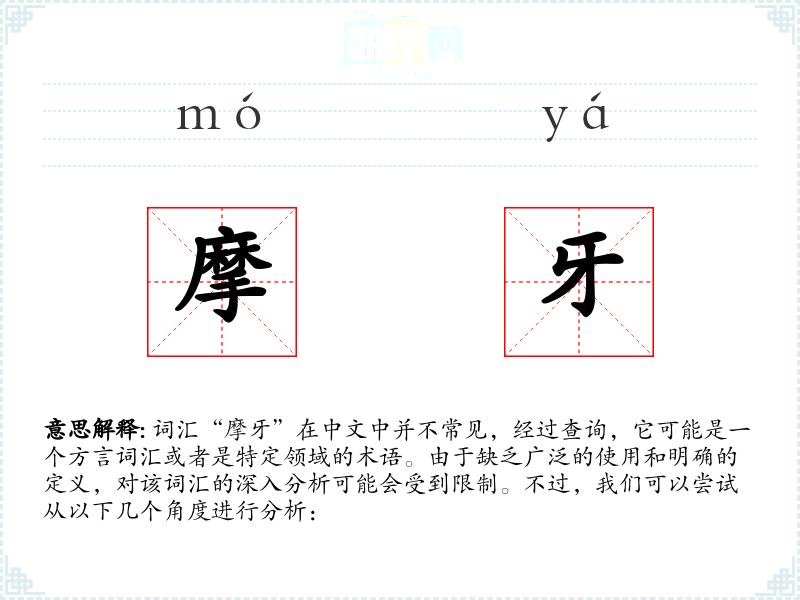 综上所述,词汇“摩牙”可能是一个方言词汇或特定领域的术语,但由于缺乏广泛的使用和明确的定义,我们无法对其进行深入的分析和讨论。如果“摩牙”是一个特定领域的术语,建议咨询相关领域的专家以获取更多信息。