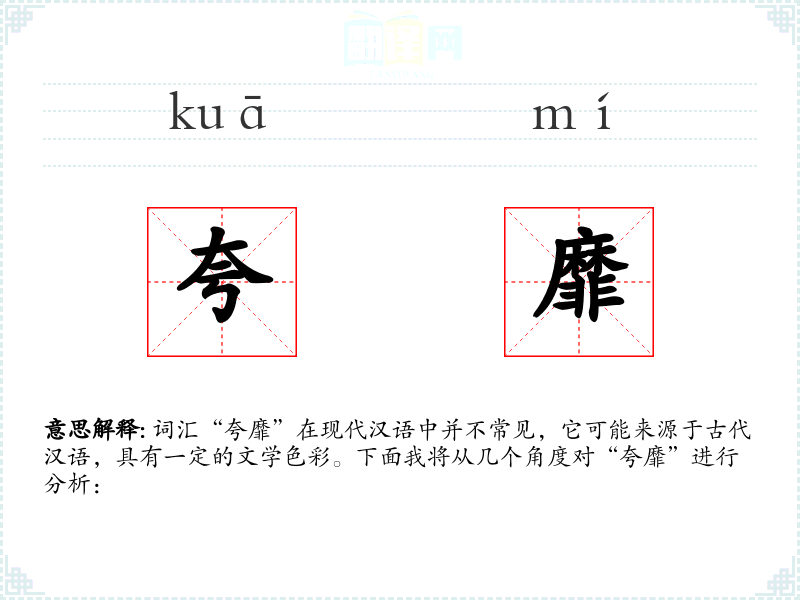 词汇“夸靡”在现代汉语中并不常见,它可能来源于古代汉语,具有一定的文学色彩。下面我将从几个角度对“夸靡”进行分析: