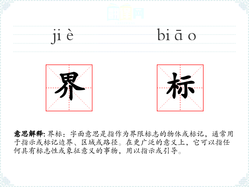 界标:字面意思是指作为界限标志的物体或标记,通常用于指示或标记边界、区域或路径。在更广泛的意义上,它可以指任何具有标志性或象征意义的事物,用以指示或引导。