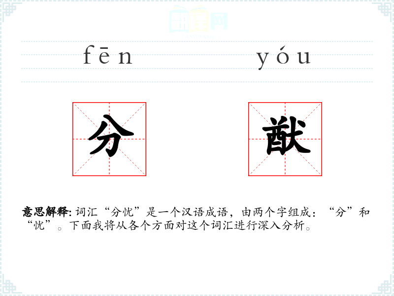 词汇“分忧”是一个汉语成语,由两个字组成:“分”和“忧”。下面我将从各个方面对这个词汇进行深入分析。