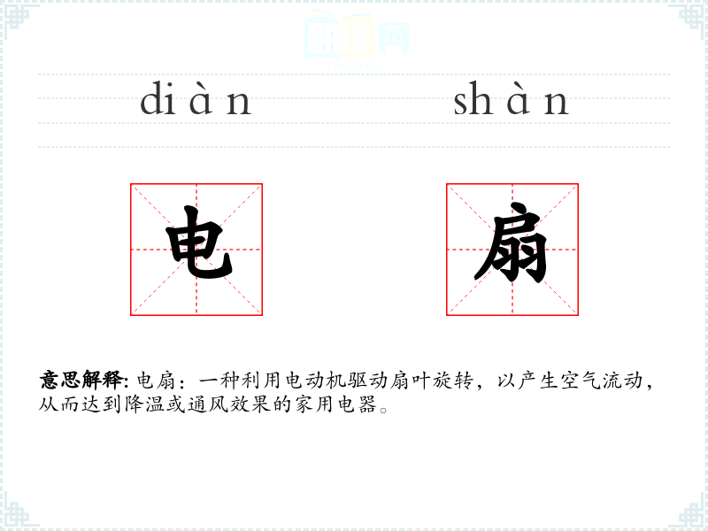 电扇:一种利用电动机驱动扇叶旋转,以产生空气流动,从而达到降温或通风效果的家用电器。