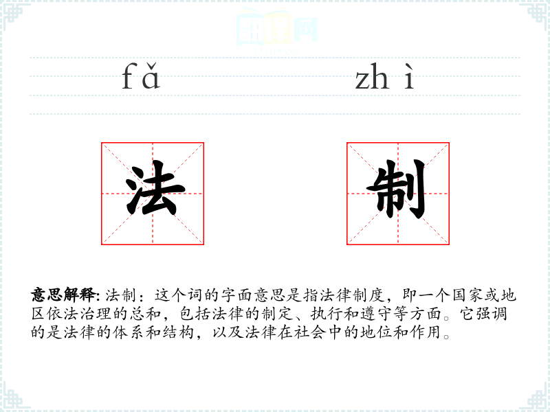 法制:这个词的字面意思是指法律制度,即一个国家或地区依法治理的总和,包括法律的制定、执行和遵守等方面。它强调的是法律的体系和结构,以及法律在社会中的地位和作用。