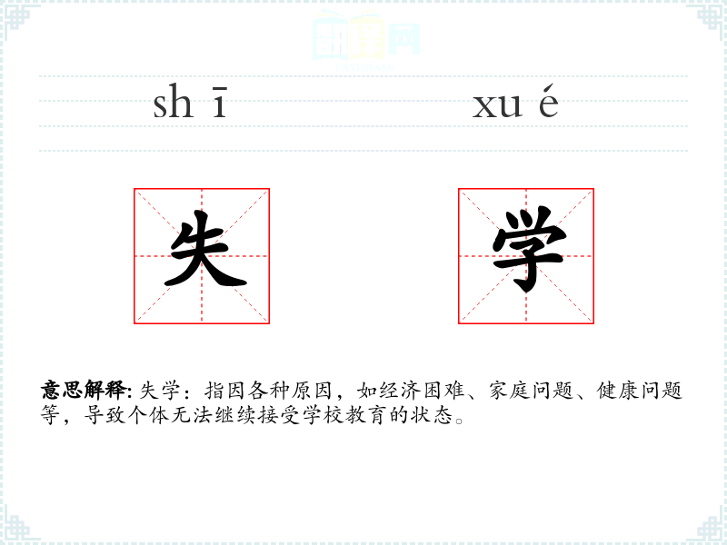 失学:指因各种原因,如经济困难、家庭问题、健康问题等,导致个体无法继续接受学校教育的状态。