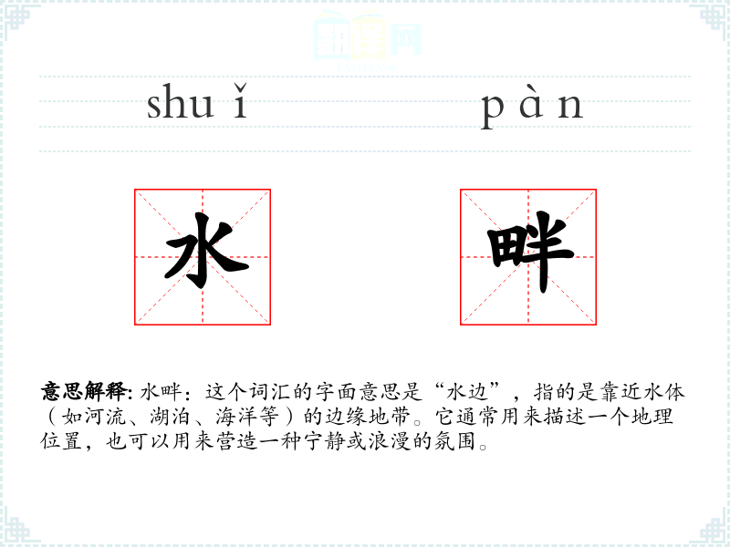 水畔:这个词汇的字面意思是“水边”,指的是靠近水体(如河流、湖泊、海洋等)的边缘地带。它通常用来描述一个地理位置,也可以用来营造一种宁静或浪漫的氛围。