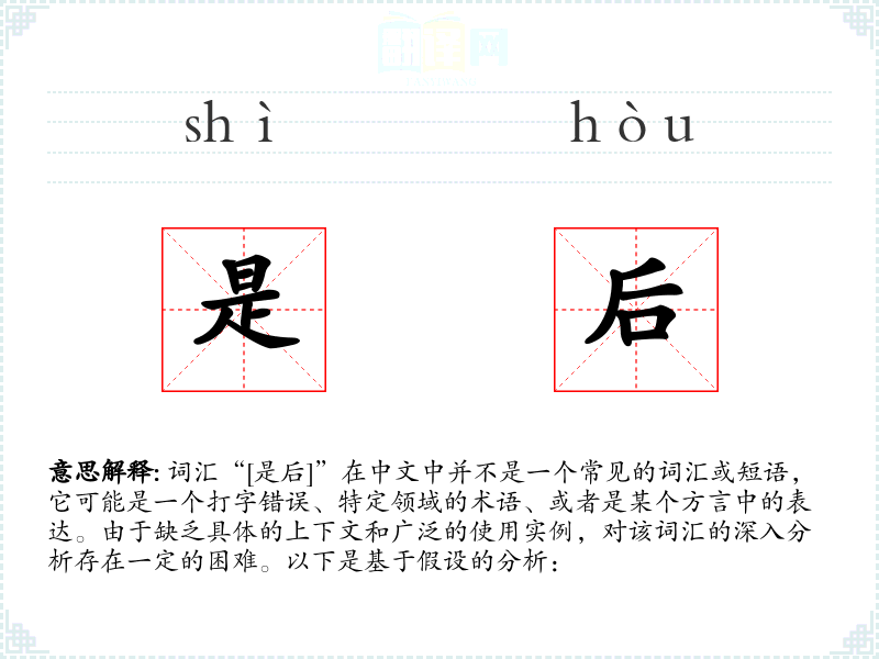由于“[是后]”不是一个标准词汇,它在我语言学习和表达中的重要性非常有限。如果是一个打字错误,正确的表达应该是“时候”、“事后”等。如果是一个特定领域的术语或方言表达,那么它的含义将取决于具体的上下文和使用环境。